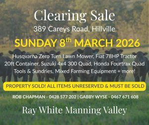 CLEARING SALE 389 Careys Road, Hillville – Sunday 8th March 2026 For more information: https://www.rea-webbooks.com.au/Ray-White-Manning-Valley/Clearing-Sale-389-Careys-Road-Hillville-RWMV